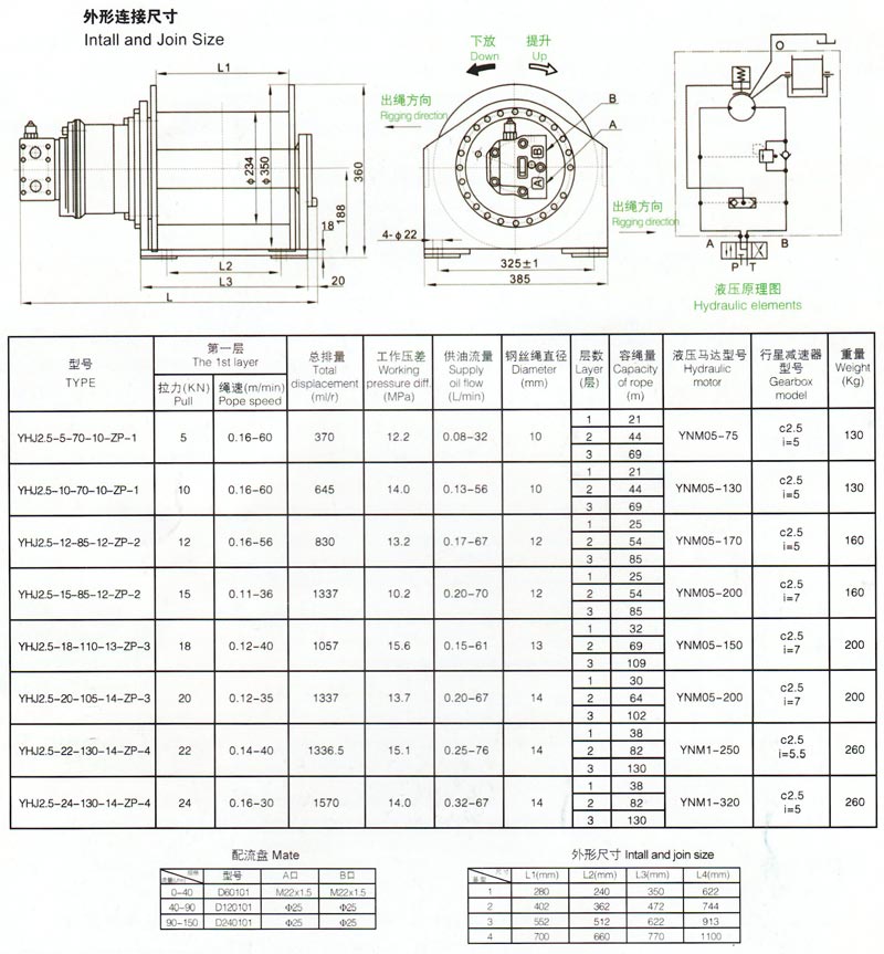 YHJ系列液压绞车由带单向平衡阀及控制制动器的高压梭阀组成的各种配流器, YNM、 YHM型液压马达、Z制动器、 C型齿轮减速器、卷筒、机架等部件组成(液压原理见图),用户只需配备泵站和换向阀即可。由于绞车自带阀组,它不但 简化了液压系统而且提高了传动装置的工作可靠性。YHJ绞车自带的液压阀组成功解决了一般绞车中存在的空钩抖动和提 升中的二次下滑问题,使YHJ液压绞车在提升和下放工作中运转平稳。除此之外它还具有起动和工作效率高、能耗少、噪音低、 外型美观、尺寸紧凑、经济性好等特点,它是应用于重力破碎牵引设备;履带和汽车起重机、吊管机、抓斗和具有破碎功 能的钻机等设备中。